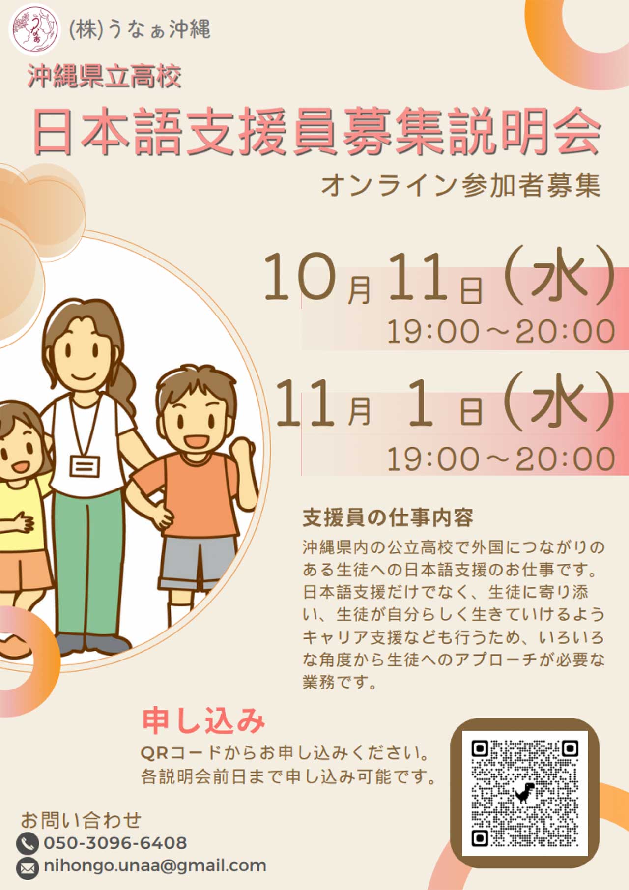 文部科学省の「日本語指導が必要な児童生徒の受入状況等に関する調査(令和3年度)※1」によると、日本語支援が必要な児童生徒数は58,307人で、前回調査より7,181人増加しており、今後も増加が予測されています。沖縄県も例外ではなく日本語支援が必要な児童生徒は増加傾向にあり、学校現場でも支援の必要性が認識されています。今年度、県教育庁県立学校教育課はそのような生徒に支援を行うべく、令和5年度県立学校日本語支援事業を開始し、株式会社うなぁ沖縄は受託企業となっております。県立学校教育課と協力し、日本語指導が必要な生徒に対する支援体制を充実させること、生徒が自立出来る力を育成すること、共生社会の実現に向けた外国人児童生徒等の教育の充実を図ることを目的とし、支援体制の充実を図るため、外国とつながる県内高校生の日本語指導および包括的な教育・支援に携わる「日本語支援員」を募集します。
